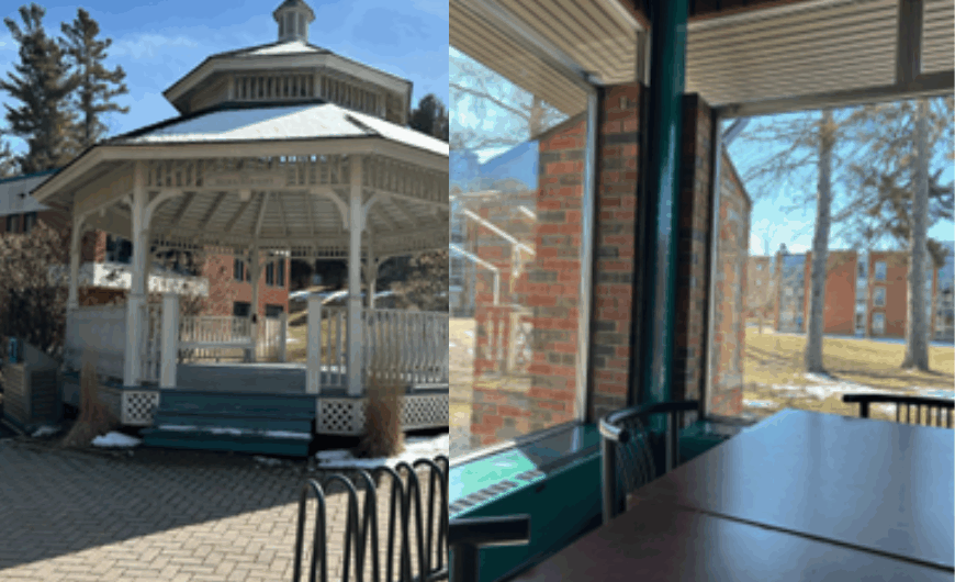When it’s sunny out, I like to do work outside. Getting fresh air is good for you, so why not get things done at the same time? There’s many tables around campus where people sit with friends or do work for their classes. On the right of the library there is a big gazebo. It’s pretty peaceful and almost always empty. I think it looks like the perfect place to do readings.